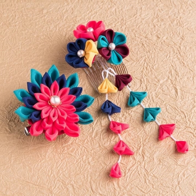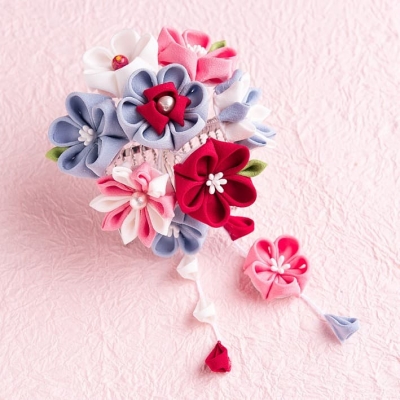 江戸時代から続く伝統工芸のつまみ細工。最初は基本的な技法で、モダンな小花のUピンを作製します。使用する正絹は好きな色が選べますよ。慣れてくると、さまざまな技法を習得し、髪飾りやブローチ、バッグチャーム、小花のかんざしなどに挑戦します。