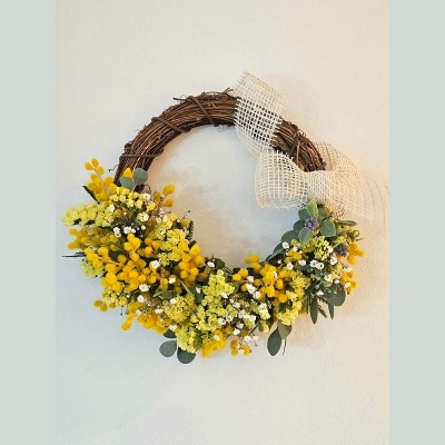 この日を記念して、愛と幸福を呼ぶといわれるミモザの花と、旬のスターチスを使って自分だけのオリジナルリースを作りましょう。
