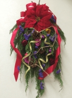 【クリスマス特別講座】スワッグとはドイツ語で「壁飾り」の意味で、リースと並んでクリスマスの伝統的な飾りの一つ。生のヒバを使って、ポインセチアやプリザーブド、松ぼっくり、リボンやオーナメントで華やかに。玄関ドアやお部屋を飾る、存在感たっぷりの作品です。